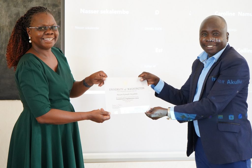 Ms Anna Grace Auma handing over the certificate of Fundamentals of Implementation Science awarded by the University of Washington, to Dr. Kenneth Anyolitho